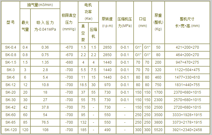 Sk系列水環式真空泵及壓縮機是用來抽吸或壓縮空氣和其它無腐蝕性、不溶于水、不含有固體顆粒的氣體,以便在密閉容器中形成真空和壓力。但吸入氣體允許混有少量液體。